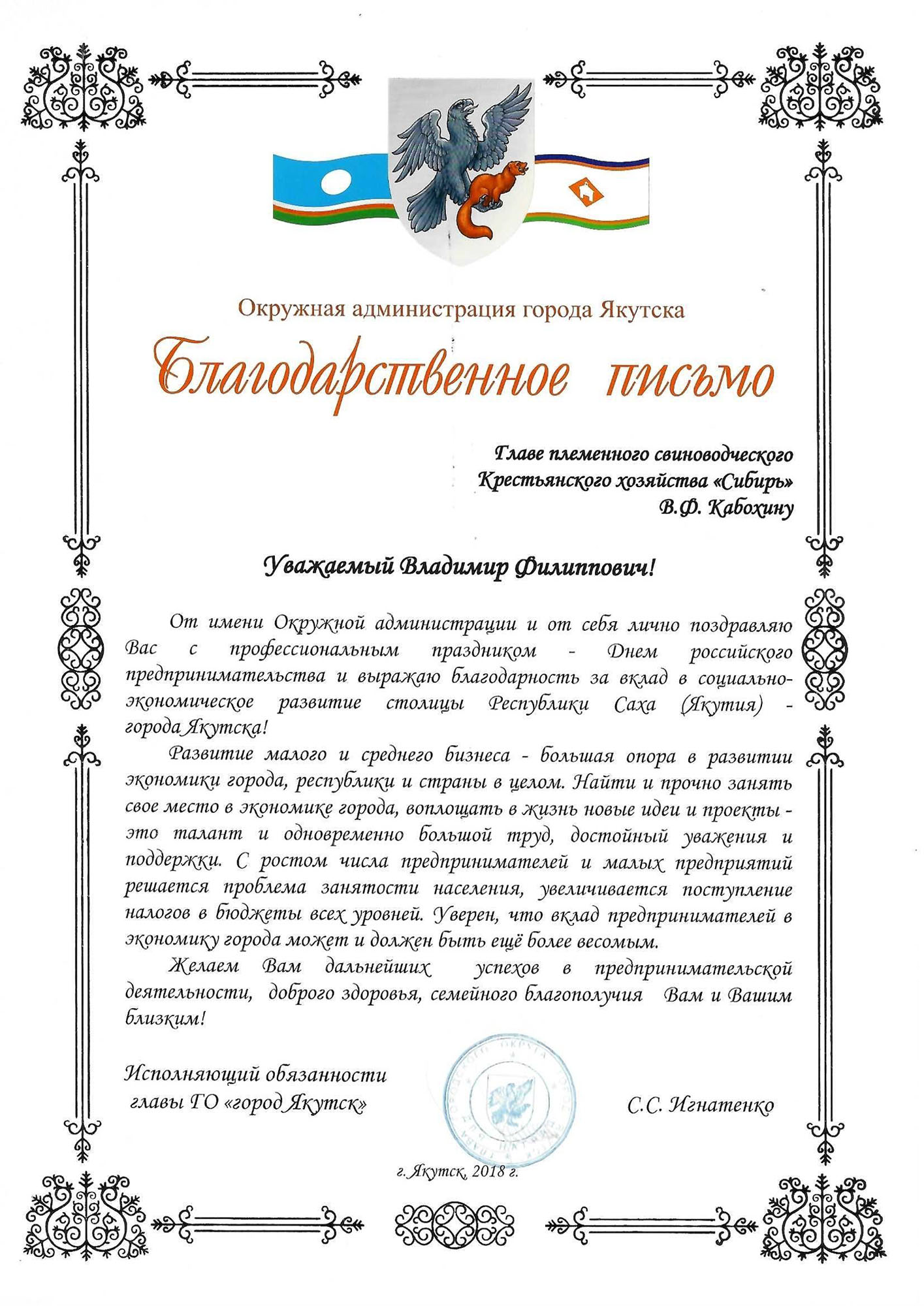 За долголетнюю безупречную работу и большой личный вклад в развитие племенной работы Владимир Филиппович награжден почетным званием «Заслуженный работник сельского хозяйства Республики Саха (Якутия)», удостоен знака «Отличник сельского хозяйства Республики Саха (Якутия)».