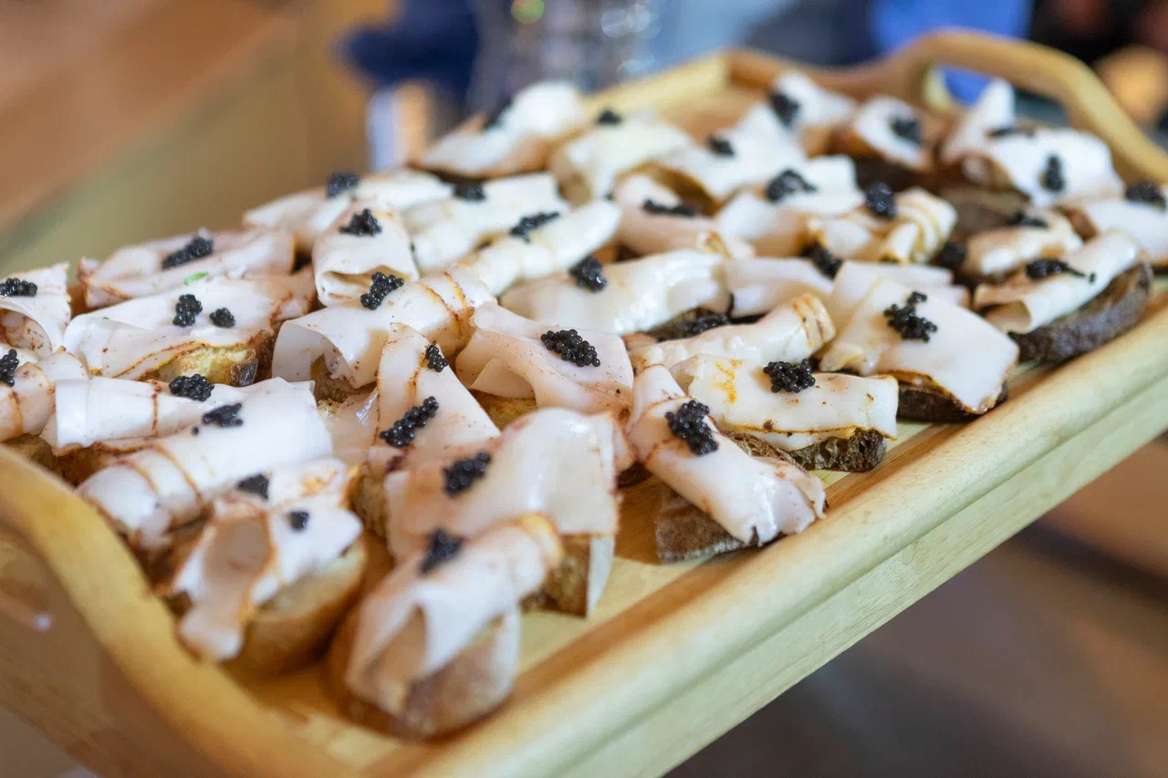 На суд гостей мы презентовали бутерброды с нашим фирменным якутским салом в современном прочтении: с черной икрой на сливочной бриоши, с хреном и хрустящим картофелем на конопляно-ржаном хлебе, а также с ферментированным (черным) чесноком на гречишном хлебе. Закуска выглядела очень аппетитно и мгновенно разлетелась среди посетителей праздника.